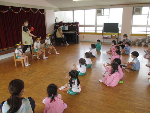 ばら組、もも組一緒に川井先生とリトミックをしました(*^。^*) すずやフープを使い音の聞き分けやピアノに合わせて歩いたりと、たくさん身体を動かし、楽しみました\(^o^)/ お友達も先生もノリノリでした(^○^)